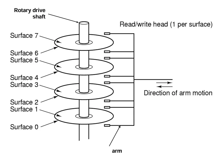 - 移动头:每个盘面有一个读写头,读写头安装在一个可移动的臂上。
