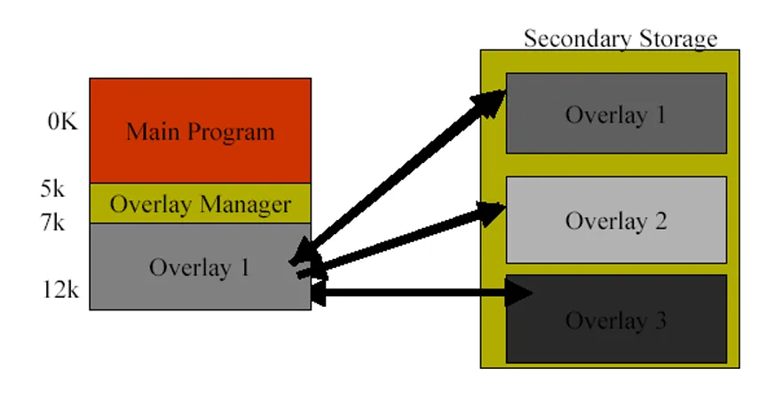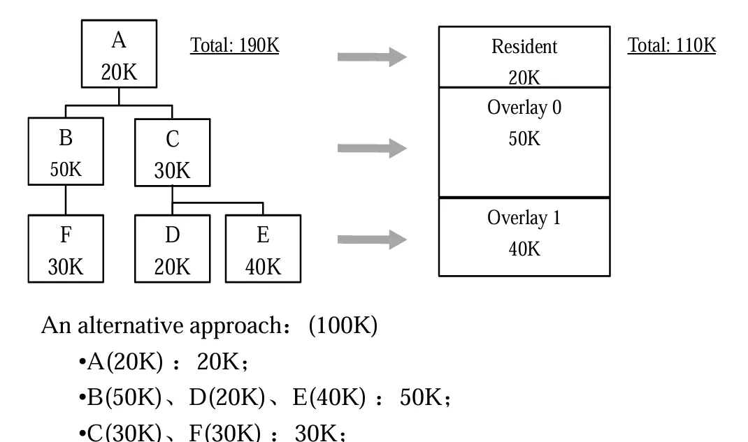 - 覆盖技术的操作方式:程序员需要把程序划分成几个段,然后利用局部性原理,在程序执行期间选择一些段保存在内存中。