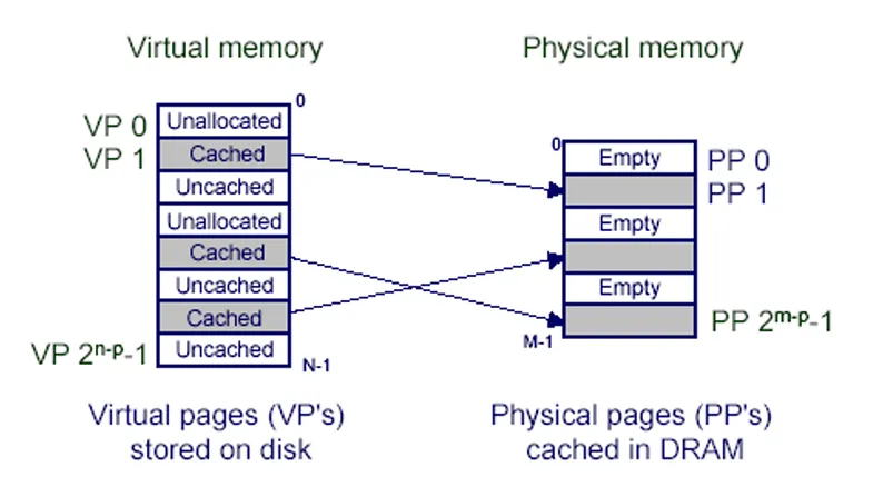 - 虚拟内存是存储在磁盘上的由 N 个连续字节组成的数组,这个磁盘上数组的内容会被缓存在物理内存中。